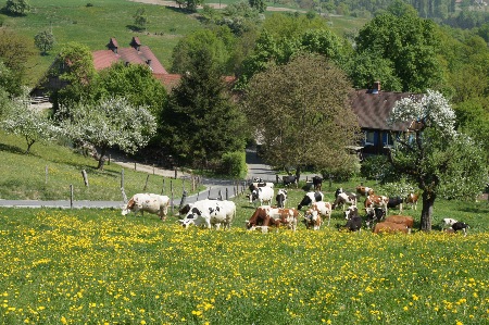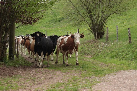 Unsere Milchkühe und ihre Kälber können von März bis November auf die Weide und frische Kräuter und Gräser genießen.